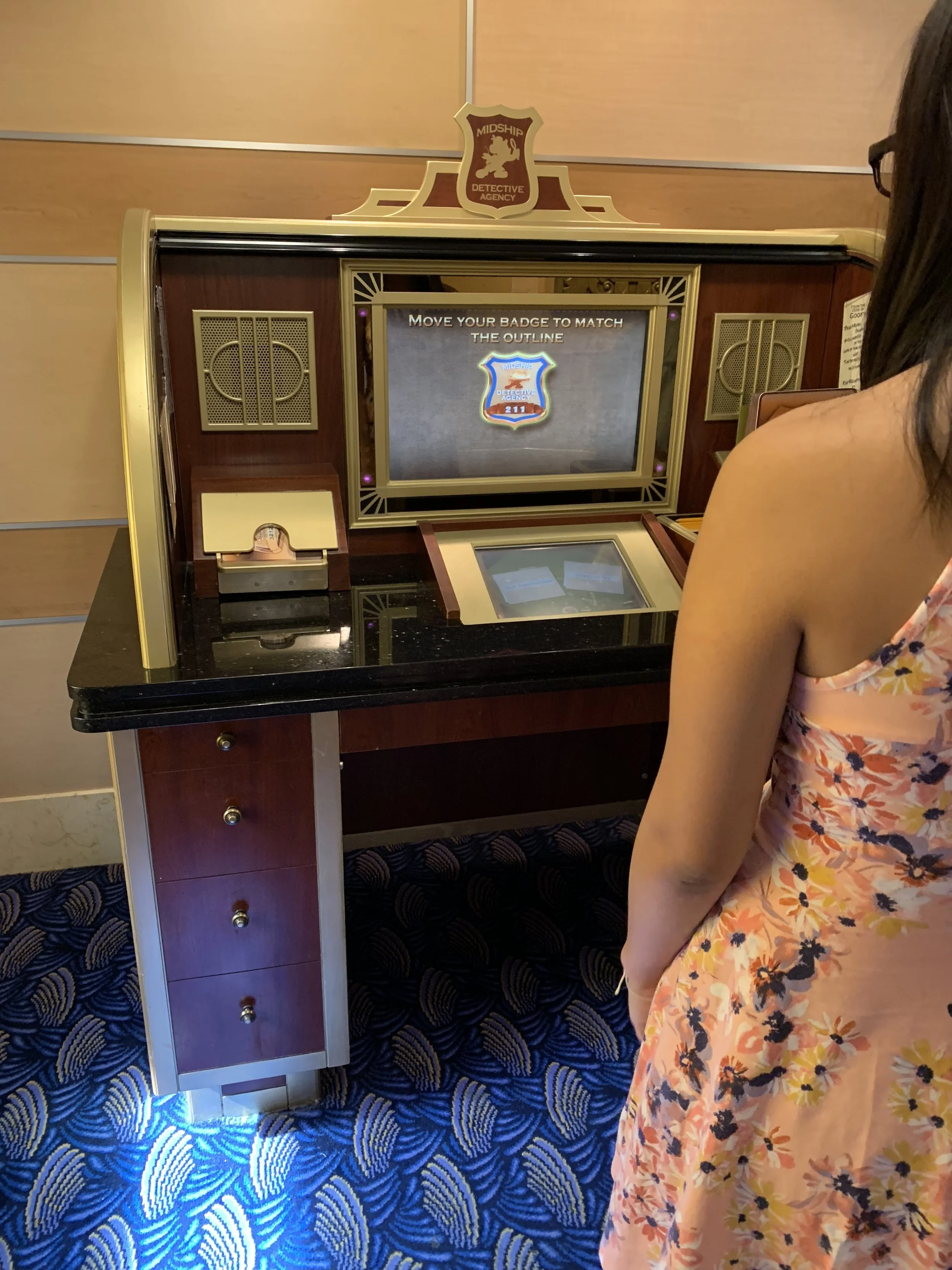 You’ll receive instructions from Mickey in a debriefing, then pick up a casebook (map) and detective badge (QR code), and a pencil. After you try out the badge, you’re off!